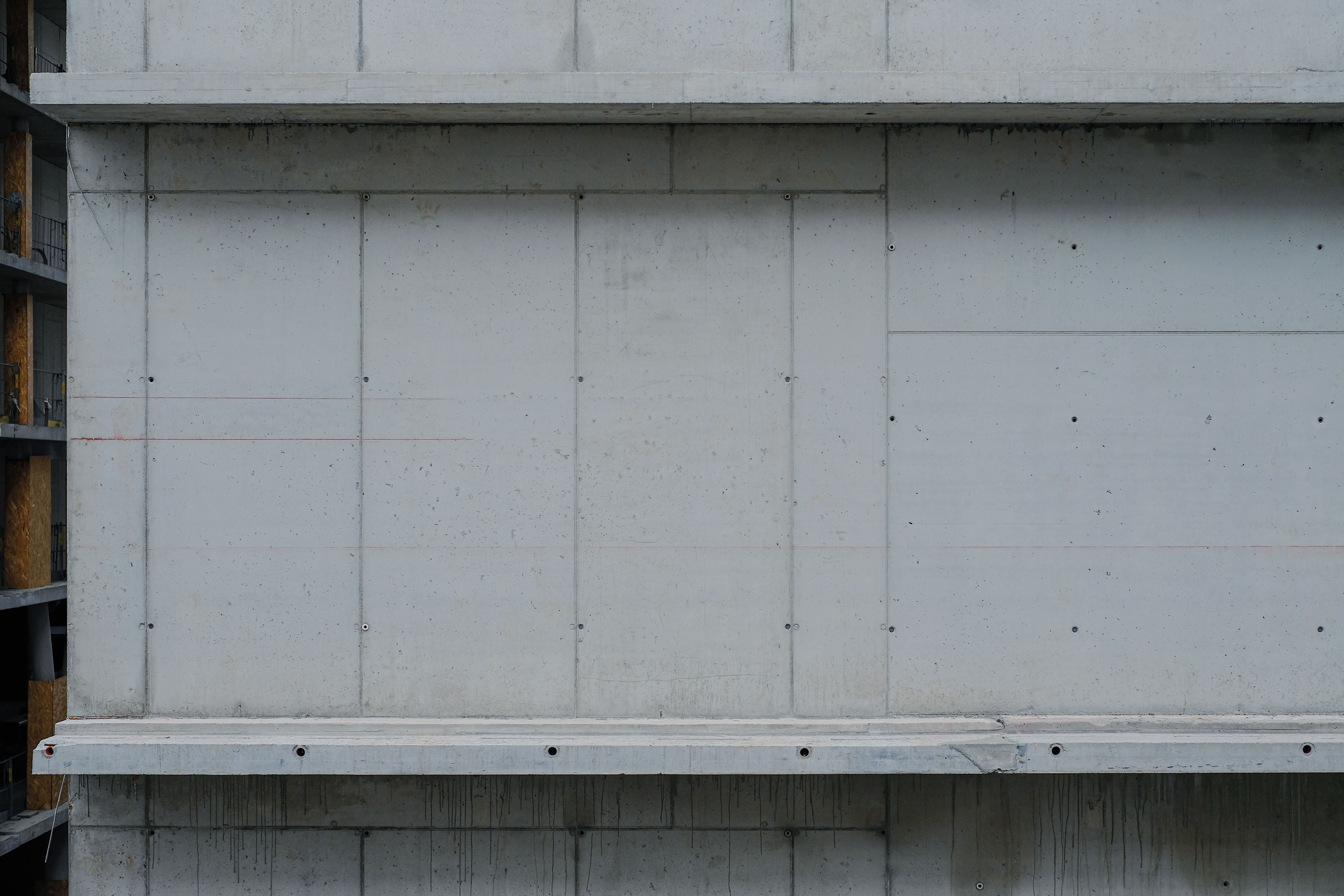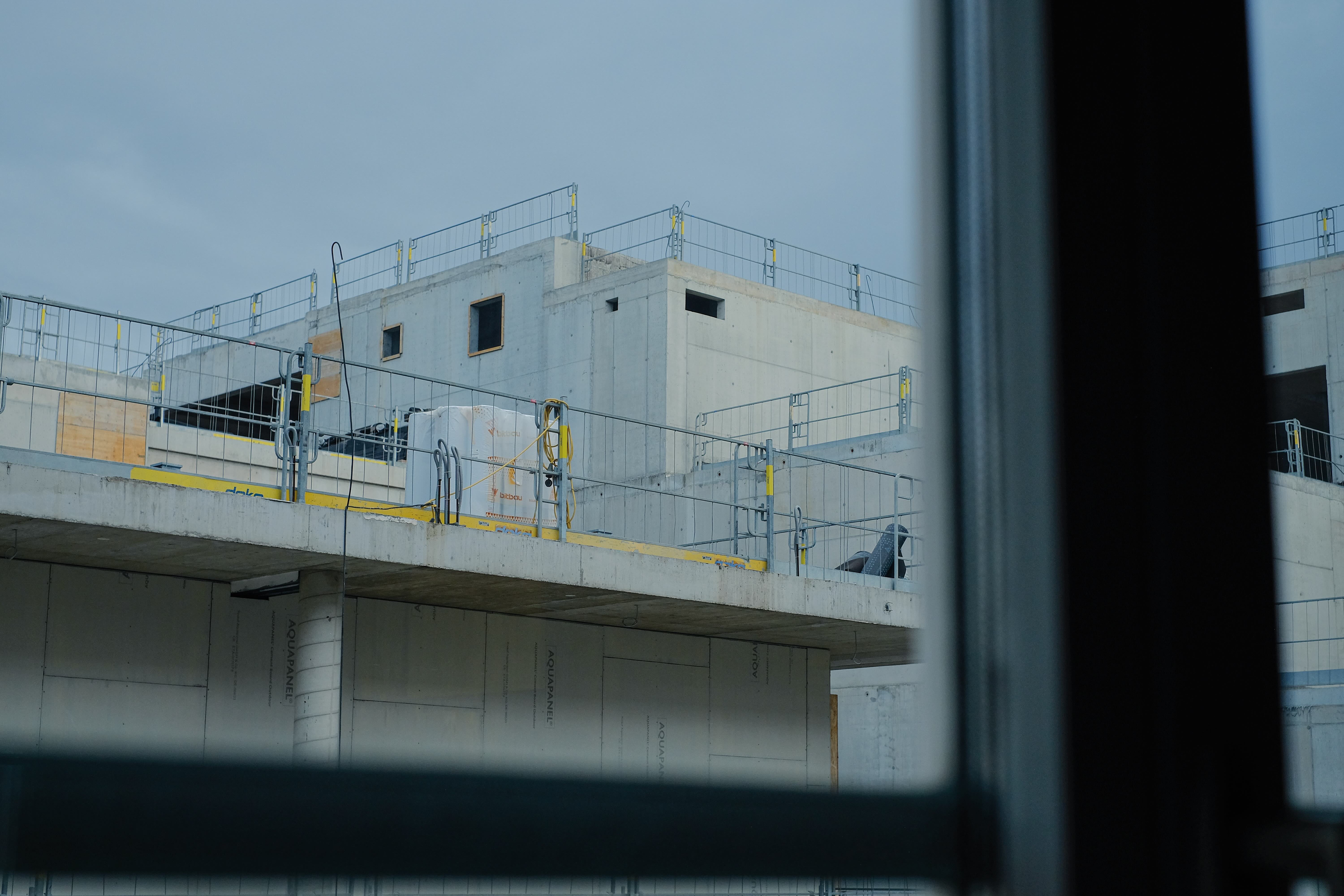 über die Rohbaustruktur und auch hindurch, still, ohne Klang. Der Staub inexistent,